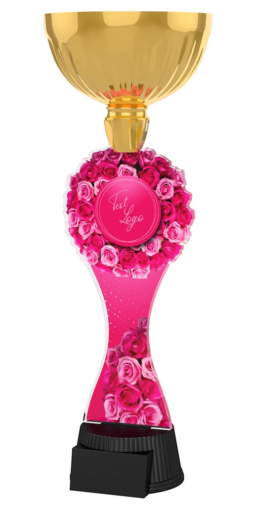 Akrylátová trofej. Prostor pro logo a text je plně přizpůsobitelný – můžete zde mít svůj vlastní návrh. V ceně trofeje není zahrnuta cena štítku. Akrylátový motiv 0.6 cm. Zlatý kalich. Výšky trofejí jsou orientační. Oboustranný tisk.