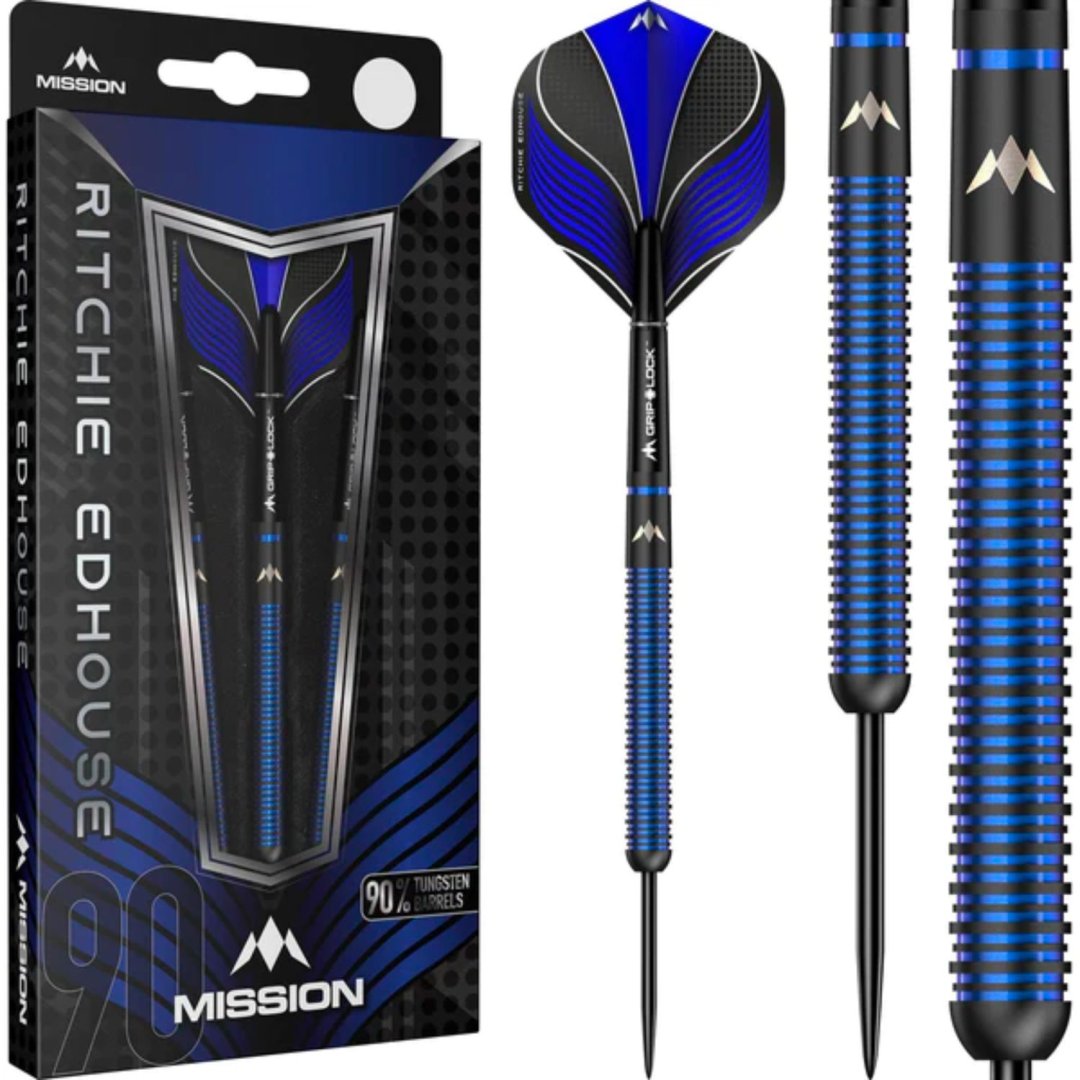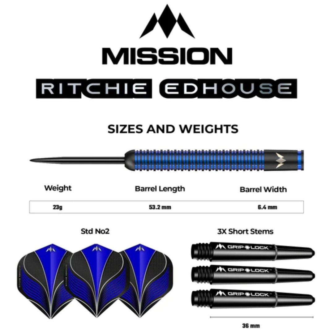 Steelové šipky Mission Ritchie Edhouse jsou wolframové šipky (90% tungsten) v moderním designu. Rovné černé barrely jsou po celé délce drážkované a modré proužky jim dodávají jedinečný design. Zdobí je logo Mission.