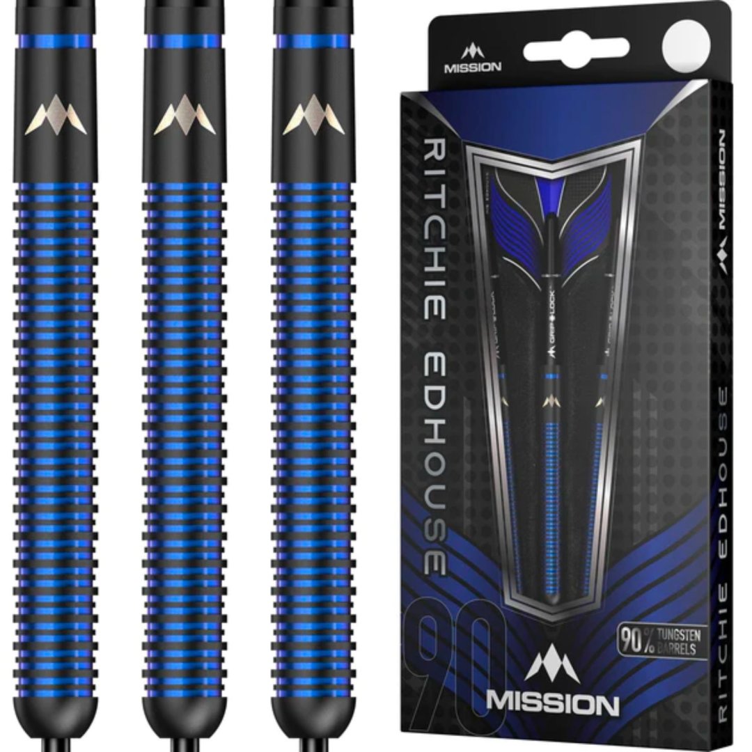 Steelové šipky Mission Ritchie Edhouse jsou wolframové šipky (90% tungsten) v moderním designu. Rovné černé barrely jsou po celé délce drážkované a modré proužky jim dodávají jedinečný design. Zdobí je logo Mission. Barrely jsou doplněny nylonovými násadkami Grip Lock a letkami Mission.