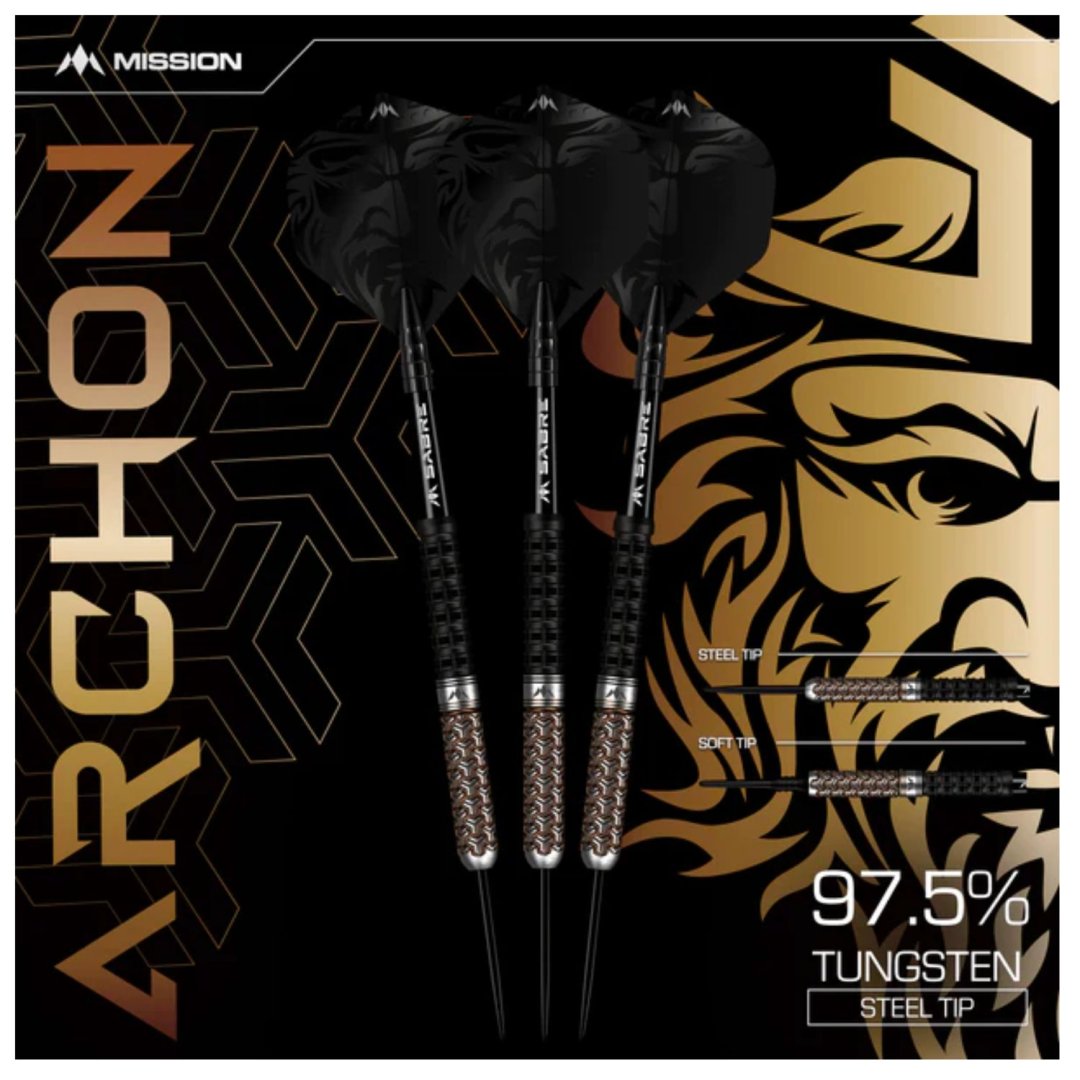Steelové šipky Mission Archon jsou wolframové šipky (97,5% tungsten) v jedinečném designu. Černo-bronzové barrely mají dokonalé drážkování, které šipce dodává unikátní vzhled. Vyfrézované symboly Archon na barrelech jsou zvýrazněny bronzovým PVD povlakem. Zadní část barrelu obsahuje jemné radiální drážky s horizontálními frézovanými drážkami pro zlepšení úchopu a je potažen černým PVD povlakem. Barrely jsou doplněny nylonovými násadkami Sabre a letkami Mission.