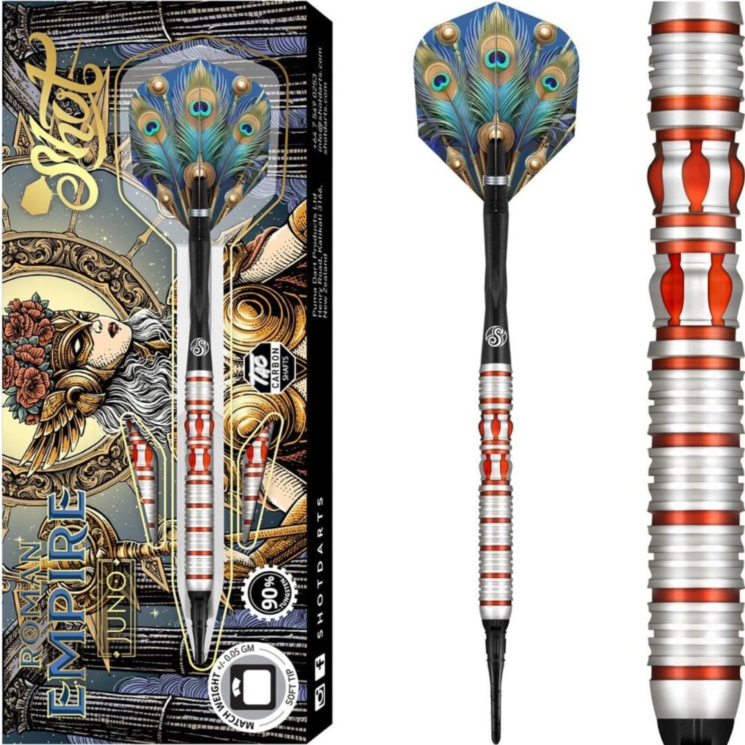 Softové šipky Shot Roman Empire Juno jsou wolframové šipky (90% tungsten) s barrely s červenými drážkami v jedinečném designu. Barrely jsou doplněny nylonovými násadkami a letkami Shot.