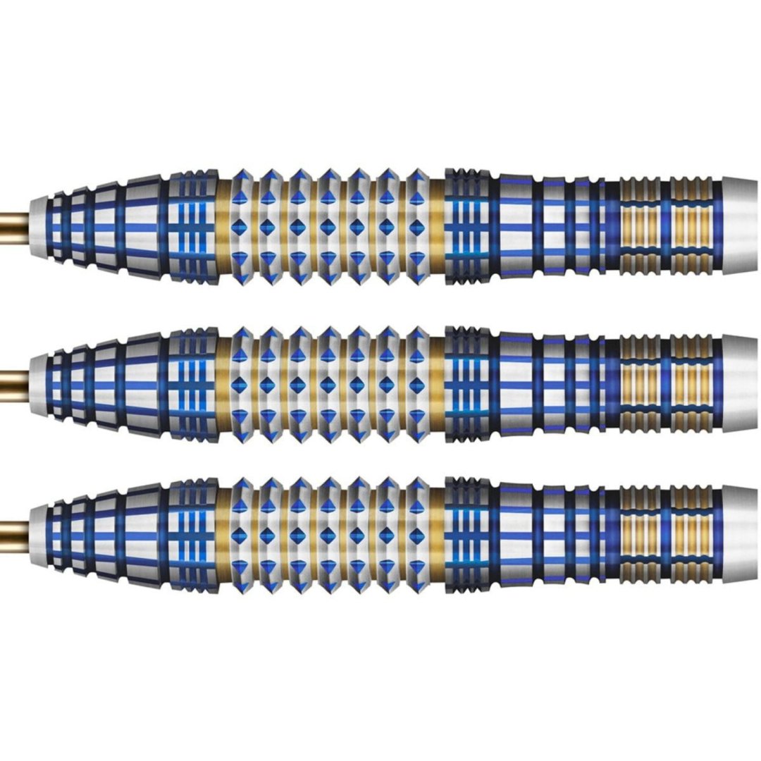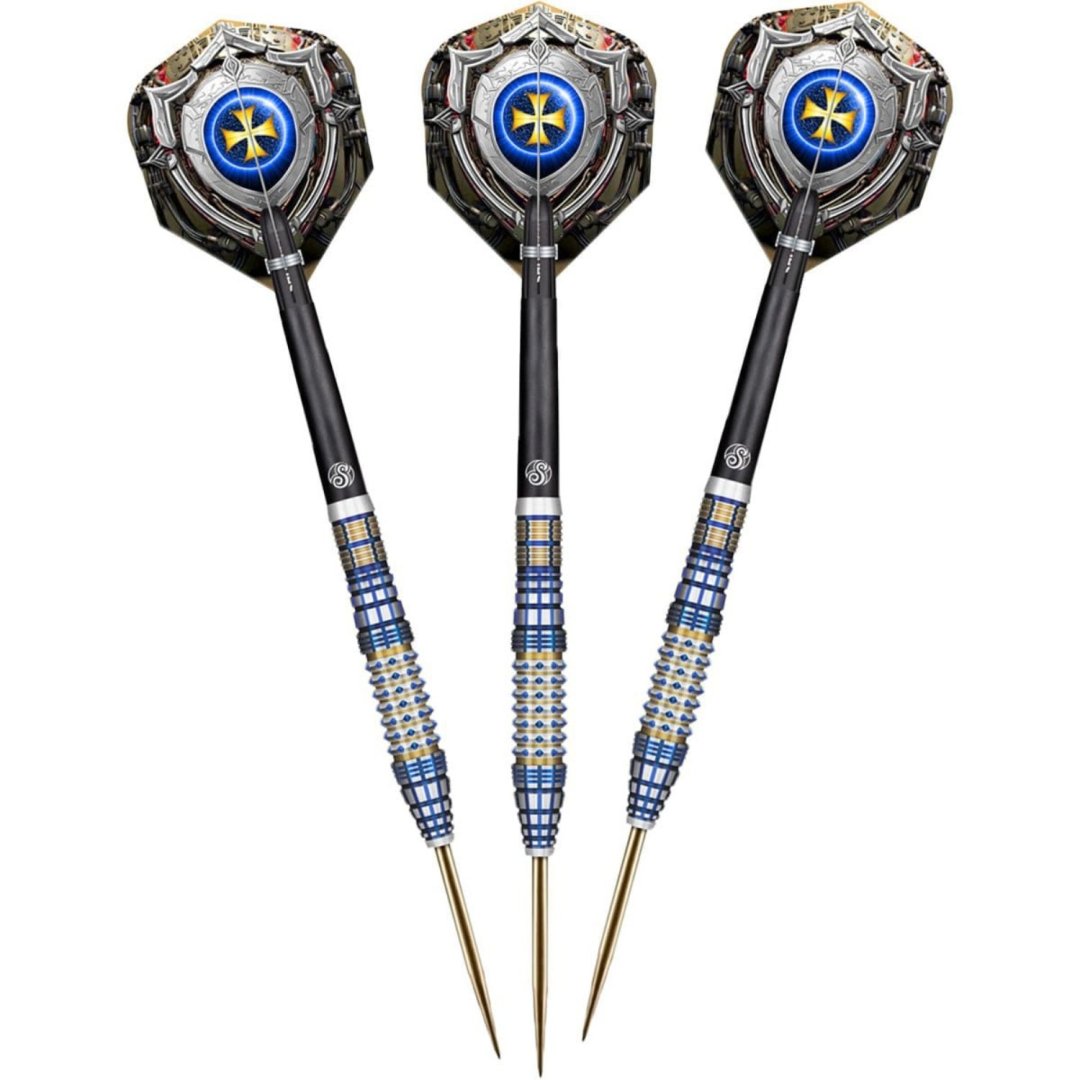 Steelové šipky Shot Future Knights Darkstar jsou wolframové šipky (90% tungsten) v úchvatném designu. Barrely mají jedinečné drážkování zvýrazněné zlatou a modrou barvou.