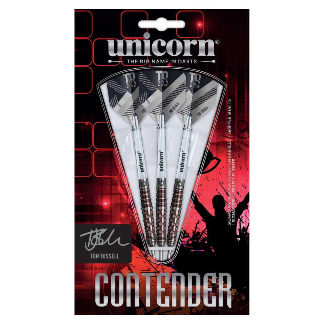 Steelové šipky Unicorn Contender - Tom Bissell jsou wolframové šipky (95% tungsten) s barrely v originálním designu. Barrely mají jedinečné drážkování zvýrazněné růžovou barvou. Barrely jsou doplněny nylonovými násadkami Gripper 4, letkami Ultrafly a hroty Volute.