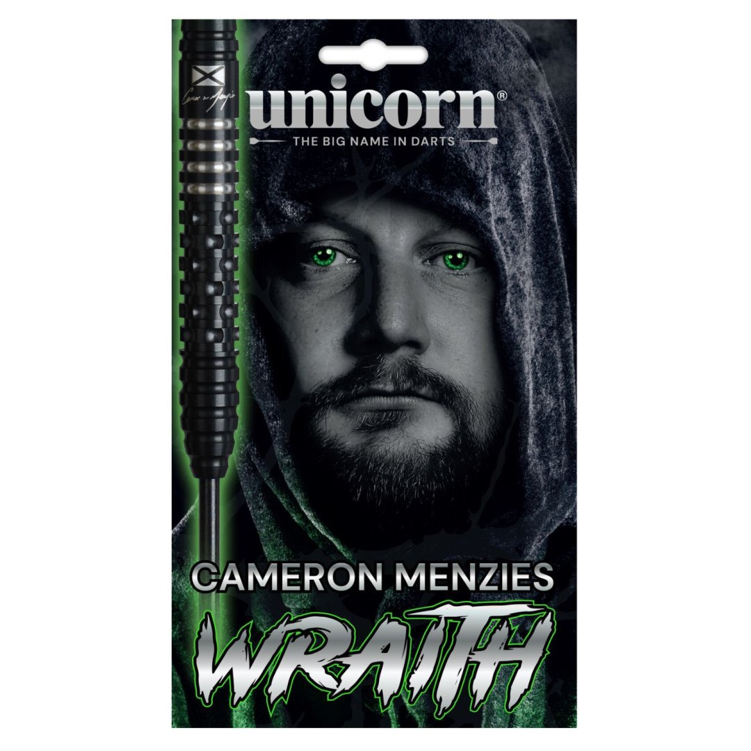 Steelové šipky Unicorn Wraith Cameron Menzies jsou wolframové šipky (90% tungsten) s černými barrely. Barrely jsou doplněny zelenými nylonovými násadkami Gripper 4, letkami Wraith a hroty Volute.