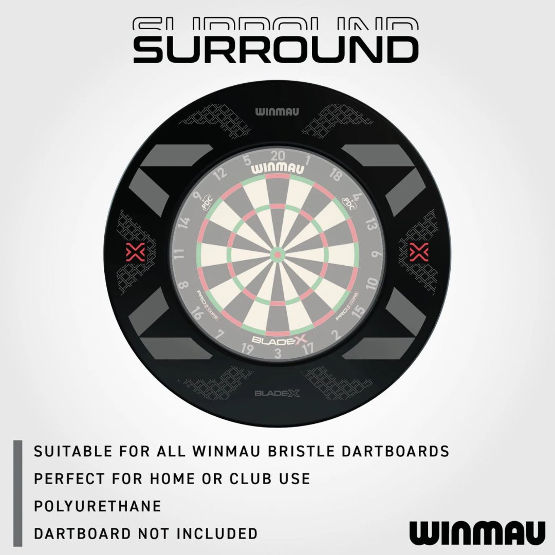 Surround byl navržen v elegantním, decentním designu, který ladí s každou místností a minimalizuje rušivé prvky. Surround byl vyvinut tak, aby pasoval na všechny sisalové terče značek Winmau, Red Dragon a Nodor. Zajišťuje tak dokonalou kompatibilitu bez mezer a posunutí a vždy zaručuje spolehlivé 360° pokrytí. Navzdory své lehké konstrukci surround vydrží intenzivní hry a dlouhé herní seance, nabízí dlouhodobou odolnost a snadnou manipulaci jak pro příležitostné hráče doma, tak pro profesionální hráče.