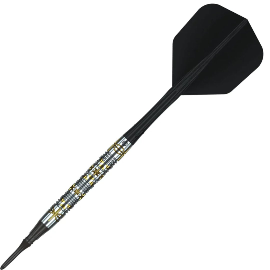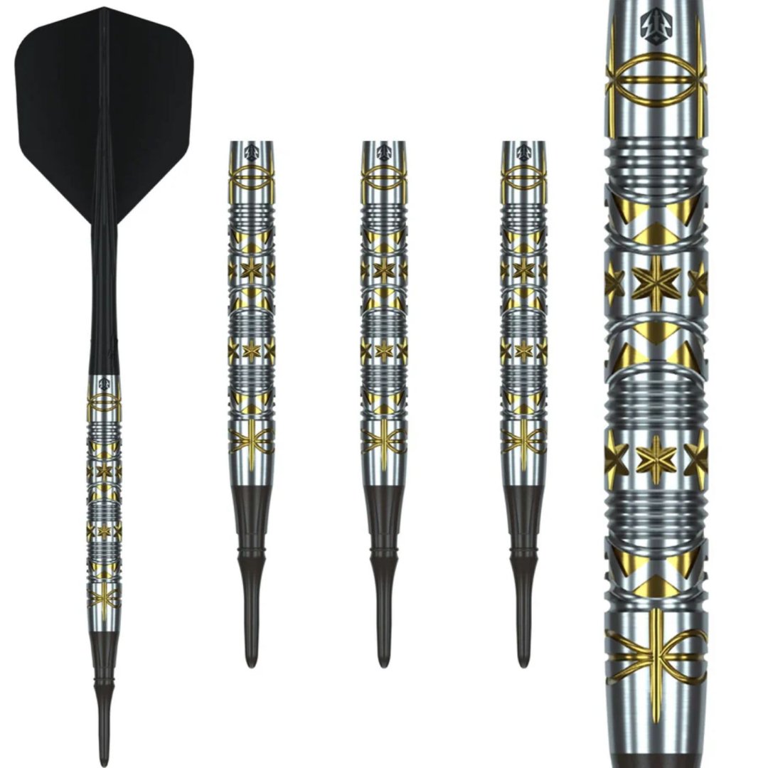 Softové šipky Caliburn Halo jsou wolframové šipky (95% tungsten) v úchvatném designu. Barrely mají jedinečné drážkování zvýrazněné zlatou barvou.