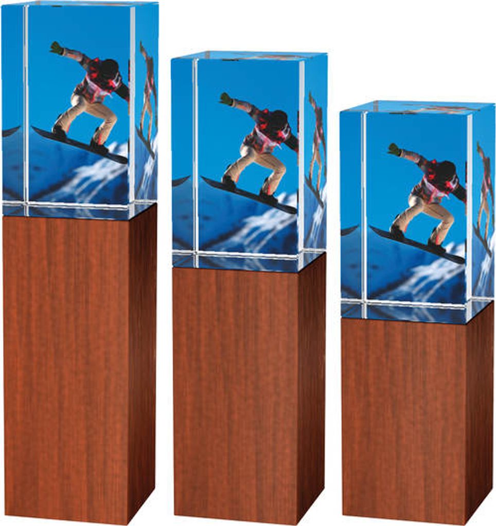 Skleněná trofej s UV HQ tiskem. Kombinace skla a dřeva. Motiv v ceně. Možnost UV HQ tisku bílou barvou na podstavec.