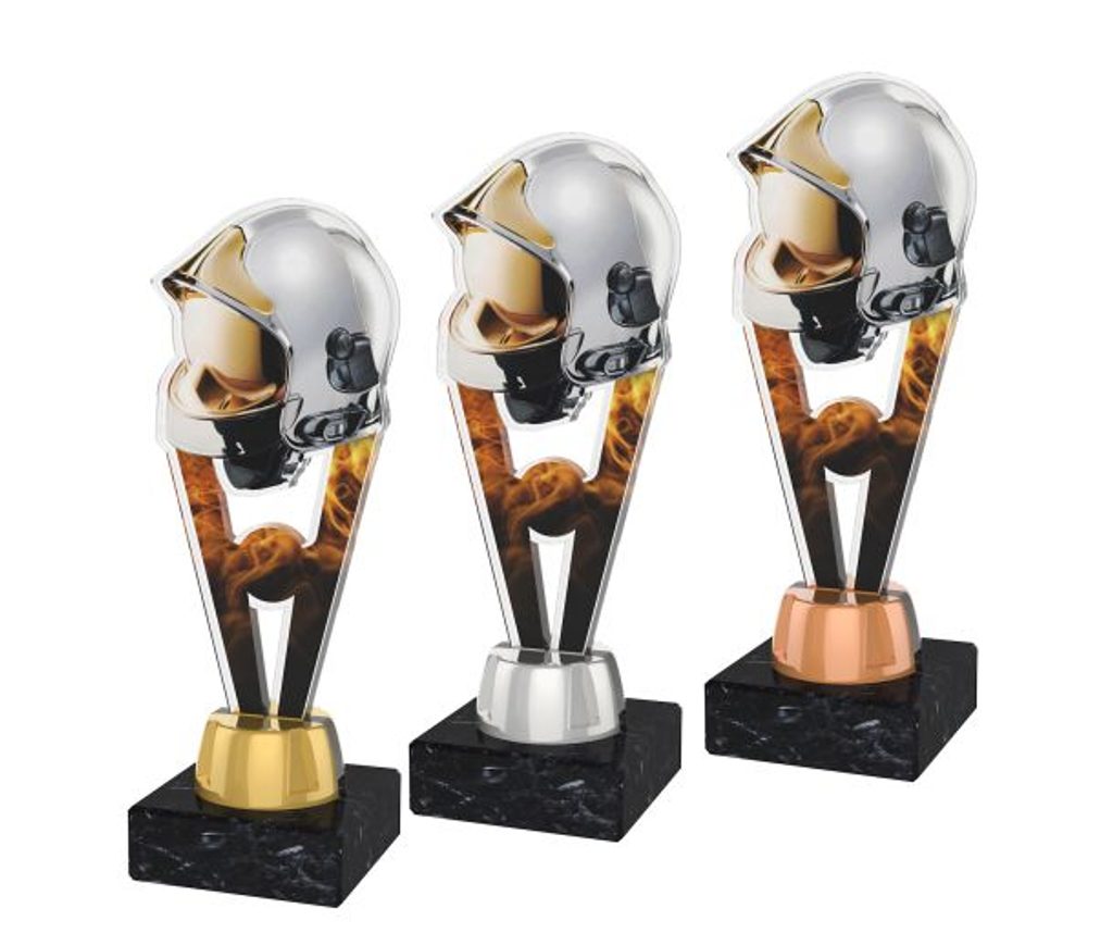 Akrylátová trofej. V ceně trofeje není zahrnuta cena štítku. Akrylátový motiv 0.6 cm. Držák motivu A-zlato, B-stříbro, C-bronz (možno vyměnit). Podstavec bílý nebo černý. Výšky trofejí jsou orientační.
