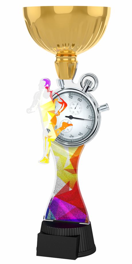 Akrylátová trofej. V ceně trofeje není zahrnuta cena štítku. Akrylátový motiv 0.6 cm. Zlatý kalich. Výšky trofejí jsou orientační. Oboustranný tisk.
