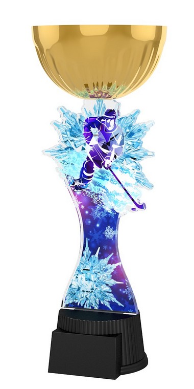 Akrylátová trofej. V ceně trofeje není zahrnuta cena štítku. Akrylátový motiv 0.6 cm. Zlatý kalich. Výšky trofejí jsou orientační. Oboustranný tisk.