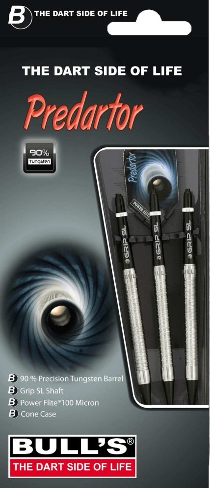 Softové wolframové šipky Bull's Predartor zaujmou především svou elegancí a dokonalostí. Barrely jsou vyrobeny z kvalitního 90% tungstenu. Barrel má jemné drážkování po celé délce a na konci šipky je logo Bull's a značka Predator. Barrely jsou doplněny násadkami B-Grip SL a letkami Power Flite. Baleno v plastovém pouzdře.