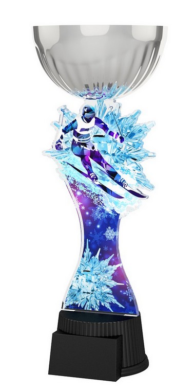 Akrylátová trofej. V ceně trofeje není zahrnuta cena štítku. Akrylátový motiv 0.6 cm. Stříbrný kalich. Výšky trofejí jsou orientační. Oboustranný tisk.