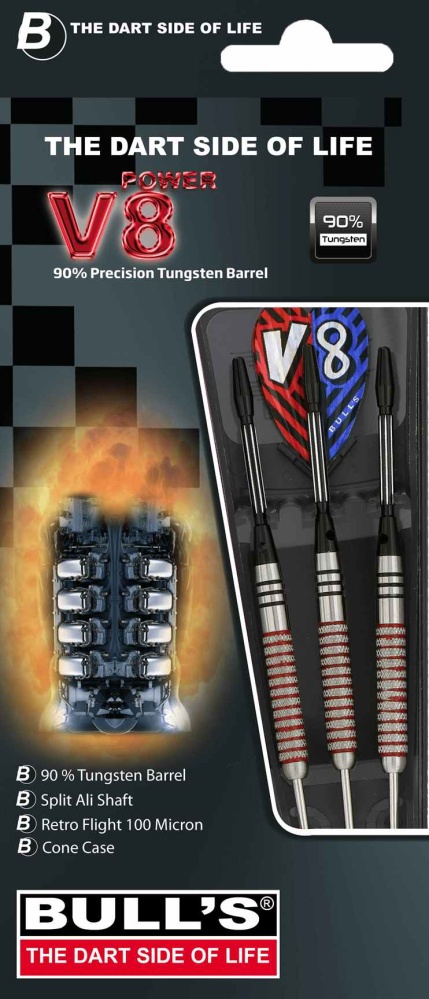 Steelové šipky Bull's V8 jsou kvalitní wolframové šipky. Barrely jsou zdrsnělé po celé délce a zdobí je černé a červené proužky. Jsou doplněny násadkami Split a letkami Retro V8. Baleno v plastovém pouzdře.