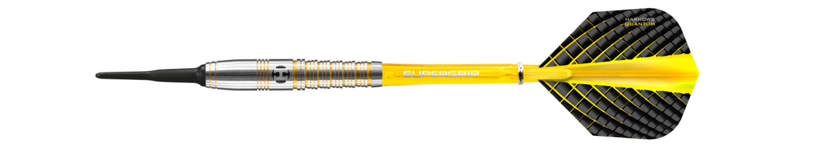Softové wolframové šipky v designu Takehiro Suzuki. Tungstenové barrely jsou zdobeny žlutými proužky a doplněny jsou násadkami Supergrip a letkami Quantum.