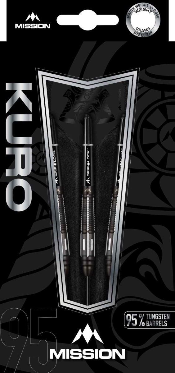 Steelové šipky Mission Kuro jsou wolframové šipky (95% tungsten) v moderním černo-stříbrném designu. Barrely mají zúženou špičku a postupně se také zužují v zadní části barrelu, kde je výrazné drážkování (Shark Grip), díky kterému se šipka skvěle drží a neprokluzuje. Černý povlak z nitridu titanu dodává šipkám jedinečný vzhled. Zadní část barrelu zdobí logo Mission. Barrely jsou doplněny nylonovými násadkami a letkami Mission.