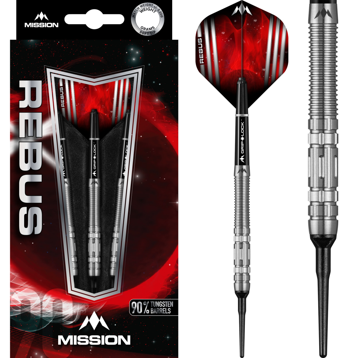 Softové šipky Mission Rebus jsou wolframové šipky (90% tungsten) ve sportovním designu. Barrely jsou kombinací různých typů drážkování. Konec barrelu zdobí logo Mission.