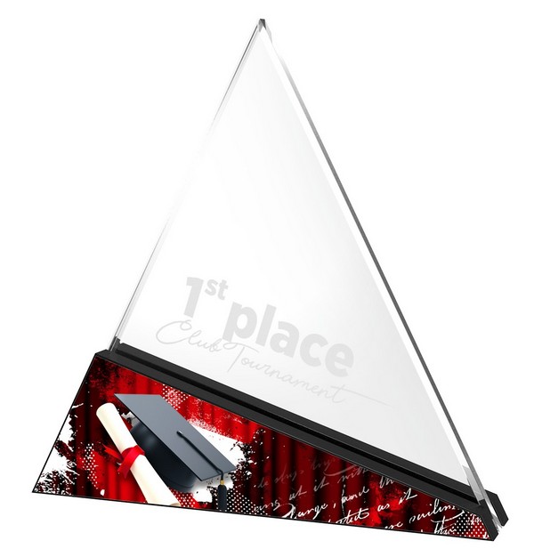 Akrylátová trofej. Jednostranný tisk. Tloušťka 0,8 cm. V ceně trofeje není zahrnuta cena štítku. Černý plastový podstavec.