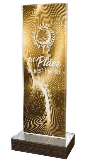 Akrylátová trofej na dřevěném podstavci se stříbrným akrylovým zrcadlem.